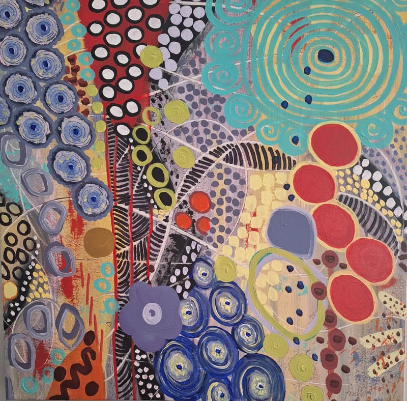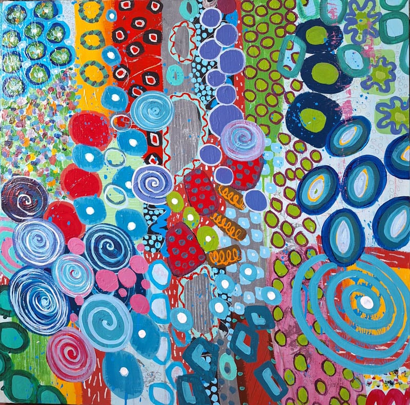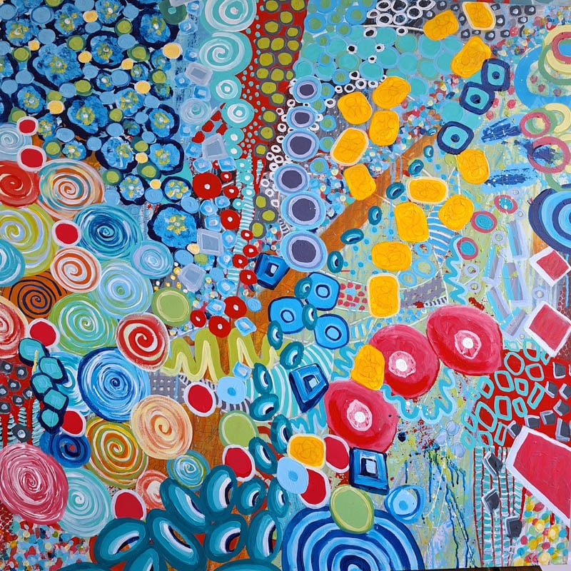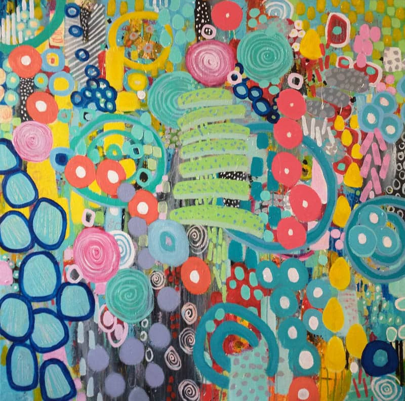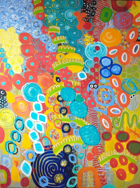 Mine are bold abstract paintings, acrylic and pencil on gallery wrapped canvas. Inspired by the beautiful shapes, textures, and colours in nature and especially in gardens, I create layers and layers of contrasting elements, freely taking myself (and hopefully the viewer) on an adventure full of wonder and hidden surprises. As the paint, pencil markings, and colourful forms take shape, my wish is for YOU to be lifted in spirit, as I am, and experience moments of true joy and happiness.