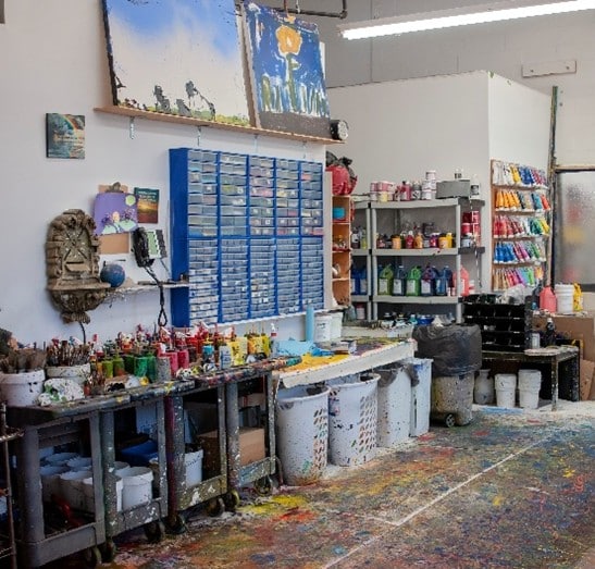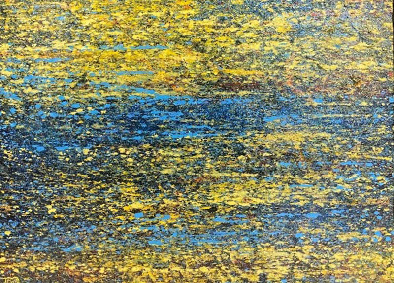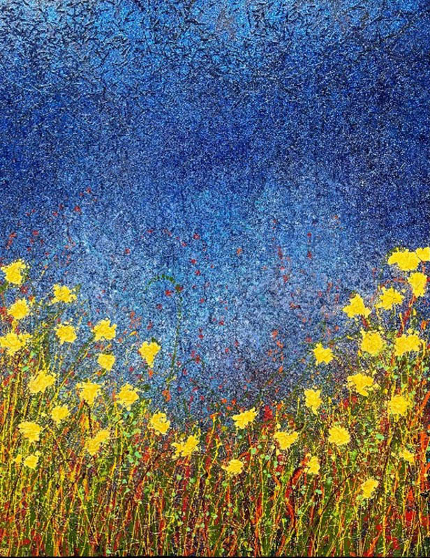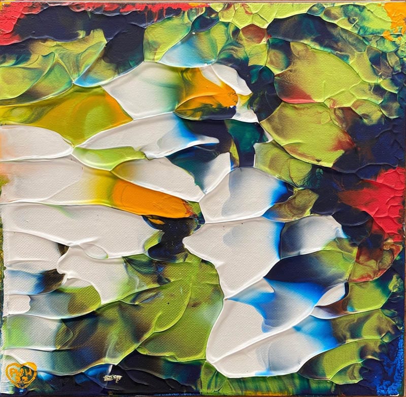 His signature style, influenced by abstract impressionism, is defined by bold primary colors and the use of acrylics and unconventional materials such as rhinestones, beads, metallic foil, and fabric. His heavily textured paintings are often described as “sculpted” offering a tactile, three-dimensional quality that engages viewers.